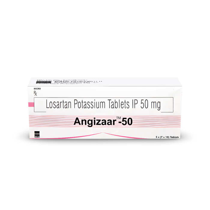 Angizaar 50 contains Losartan Potassium, an Angiotensin Receptor Blocker (ARB) to treat Hypertension (high blood pressure) and protect the kidneys in diabetic patients. This medication lowers blood pressure, reduces strain on the heart, and prevents complications such as stroke and heart attack.