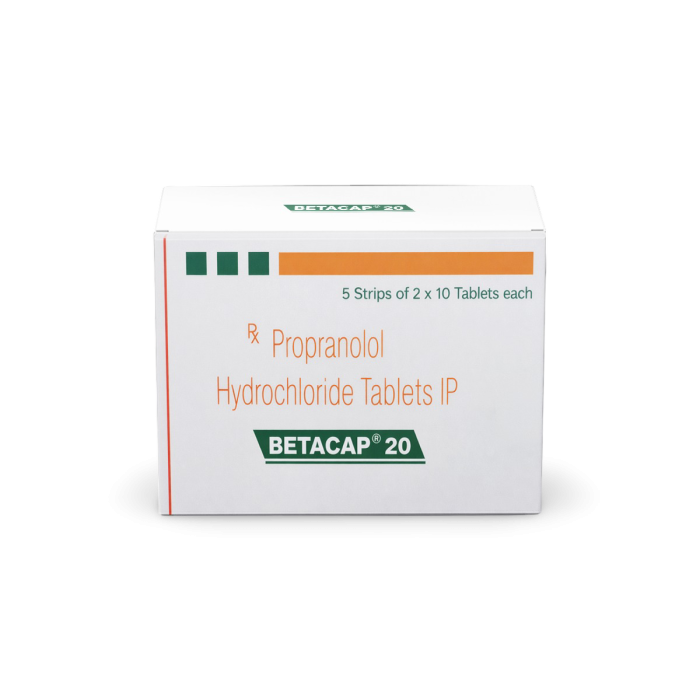 Betacap 20 mg tablet is a cardiovascular medication used to treat High Blood Pressure, Arrhythmias (irregular heart rhythms), Angina (heart-related chest pain), and to prevent heart attacks and Migraines. Its active ingredient is FDA-approved Propranolol Hydrochloride, which belongs to the non-selective beta-blocker class of medications. Sun Pharmaceutical Industries Ltd manufactures Betacap 20 in GMP-compliant facilities.
