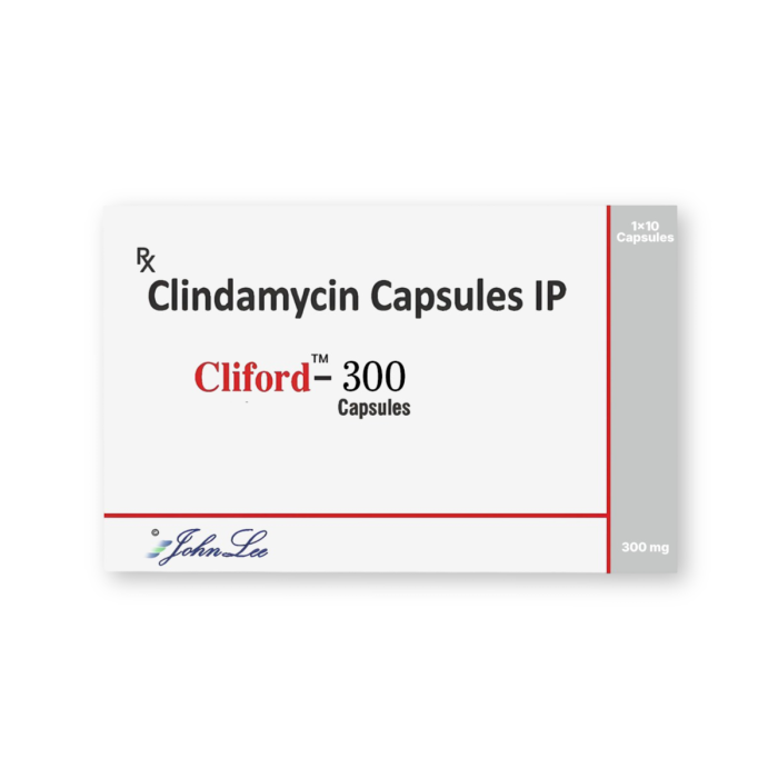 Cliford 300 mg tablet is a prescription antibiotic designed to combat bacterial infections effectively. Manufactured by Johnlee Pharmaceuticals Pvt Ltd, it contains Clindamycin (300 mg). This Lincosamide antibiotic works by inhibiting bacterial protein synthesis, preventing the bacteria from multiplying and spreading further within the body.