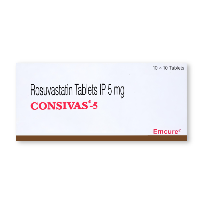 Consivas 5 tablet is a blood lipid control medication used to lower high cholesterol levels (Hypercholesterolemia or Hyperlipidemia) and reduce the risk of heart disease. It contains Rosuvastatin, a statin drug in HMG-CoA reductase inhibitors. Emcure Pharmaceuticals Ltd manufactures this medicine widely prescribed for managing Hyperlipidemia.