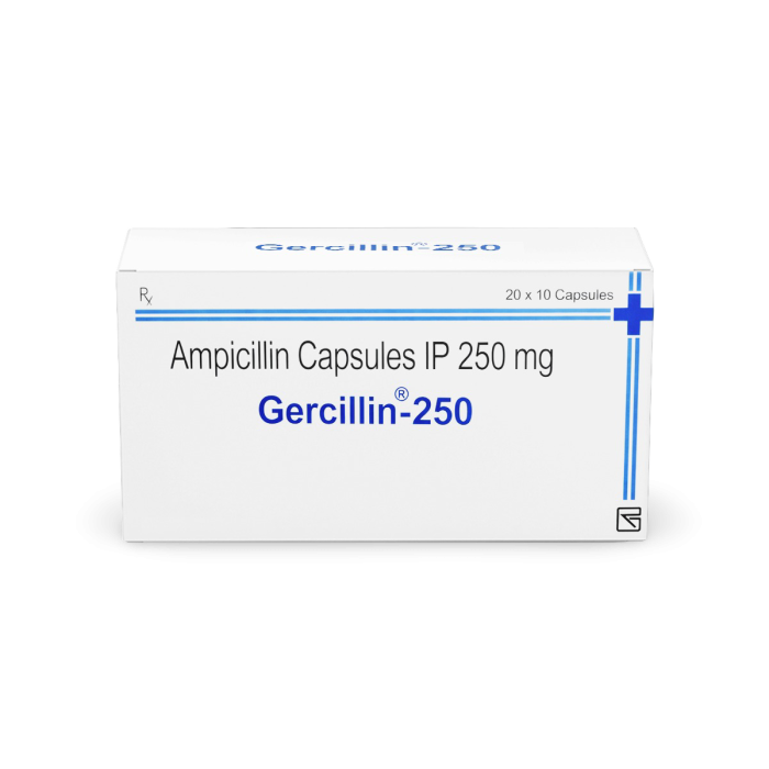 Gercillin 250 mg Capsule is a penicillin-type antibiotic medication designed to treat various bacterial infections affecting multiple body systems. The capsule contains FDA-approved Ampicillin (250 mg) as its active ingredient, which belongs to the aminopenicillin class of antibiotics. Manufactured by Zydus Cadila, India, in a GMP-compliant facility, this antibiotic ensures quality, safety, and therapeutic effectiveness for treating susceptible bacterial infections.