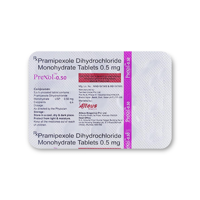 Prexol 0.50 mg is a mediation primarily used as Parkinson's disease mediation and Restless Legs Syndrome treatment. It belongs to the lass of Dopamine agonists, whih mimi the ation of Dopamine in the brain.