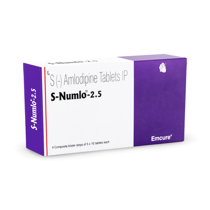 S-Numlo 2.5 mg Tablet is a prescription medicine used to treat High Blood Pressure (Hypertension). It is also used to prevent Angina Pectoris (heart-related chest pain). It is manufactured by Emcure Pharmaceuticals Ltd., a WHO-GMP-certified pharmaceutical company.