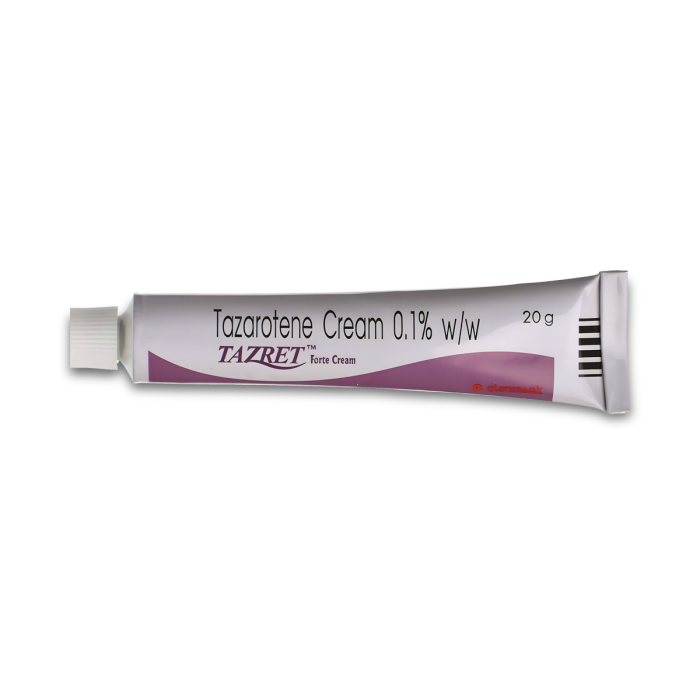 Tazret Forte Cream is a topical medication for treating psoriasis and acne. It contains Tazarotene, a retinoid derived from vitamin A, which helps regulate skin cell growth and has anti-inflammatory properties. Manufactured by Glenmark Pharmaceuticals, this cream is effective in managing skin conditions characterized by rapid cell proliferation.