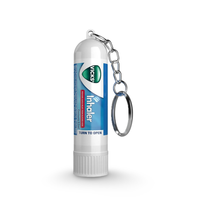 Vicks Inhaler is a non-medicated portable nasal inhaler manufactured by Procter & Gamble and Kaz Incorporated. Vicks is a well-known brand for over-the-counter respiratory products. Its inhaler contains a blend of natural ingredients, including menthol and camphor, known for their soothing properties.