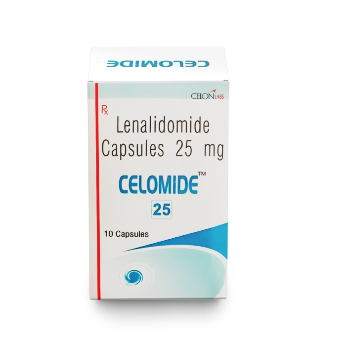 Celomide 25 Capsule is a prescription medication for treating Multiple Myeloma, Mantle Cell Lymphoma, Myelodysplastic Syndrome, and Follicular Lymphoma. It contains Lenalidomide, an immunomodulatory agent that modulates the immune response and inhibits tumor growth by affecting cancer cell development. This makes it a crucial part of cancer therapy.