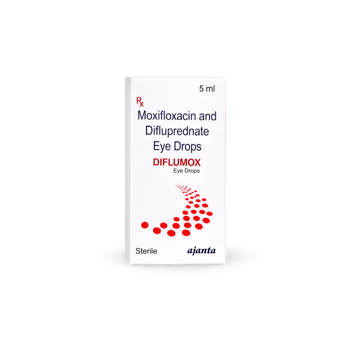 Moxifloxacin is a fluoroquinolone antibiotic, while Difluprednate is a corticosteroid that controls inflammation. Diflumox Eye Drops are manufactured by Ajanta Pharma Ltd. Both active salts are FDA-approved for ophthalmic use, and the formulation is produced in GMP-compliant manufacturing facilities, ensuring quality and safety.