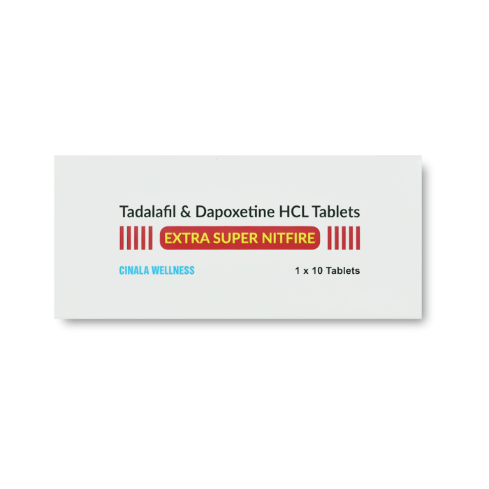 Extra Super Nitfire 100 mg is a dual-action ED pill designed to treat Erectile Dysfunction (ED) and Premature Ejaculation (PE) together. It contains Tadalafil and Dapoxetine as active salts and is manufactured by Cinala Wellness in GMP-certified facilities.