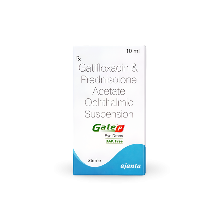 Gate P 10 ml eye drops combine two active ingredients. Gatifloxacin stops bacterial growth by blocking DNA replication, while Prednisolone reduces inflammation by suppressing the body’s immune response in the eye, helping relieve redness, swelling, and irritation caused by infection.