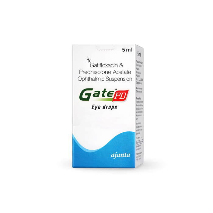 Gate PD 5 ml is a prescription ophthalmic medicine used to treat bacterial eye infections accompanied by inflammation. It contains Gatifloxacin (0.3% w/v), a Fluoroquinolone antibiotic, and Prednisolone (1% w/v), a corticosteroid that helps reduce swelling and irritation. This combination helps eliminate bacteria while controlling inflammation in the affected eye.
