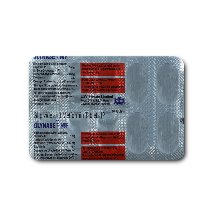 Glynase MF is an oral antidiabetic medication manufactured by USV Pvt Ltd. It combines two FDA-approved active ingredients: Glipizide (5 mg) and Metformin (500 mg). Glipizide belongs to the drug class of Sulfonylurea, and Metformin is a Biguanide. It manages Type 2 Diabetes Mellitus.