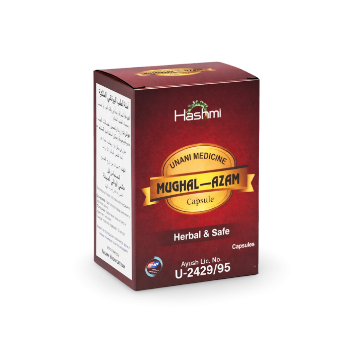 Hashmi Mughal E Azam capsule is a herbal capsule formulated to support male stamina, vitality, and physical strength. It is manufactured by Hashmi Dawakhana, a well-known name in Unani medicine, in GMP-certified facilities. It is a non-prescription supplement available over the counter in offline or online pharmacies.
