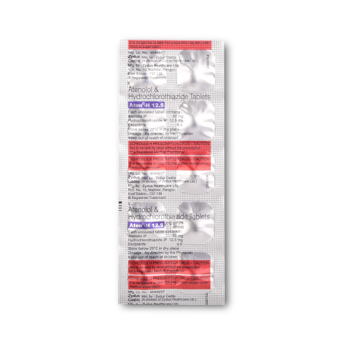 Aten-H 12.5 tablet contains Atenolol, which reduces heart rate and relaxes blood vessels, and Hydrochlorothiazide, which removes excess fluid and helps lower blood pressure. This combination reduces strain on the heart and prevents complications like heart attacks and kidney damage.