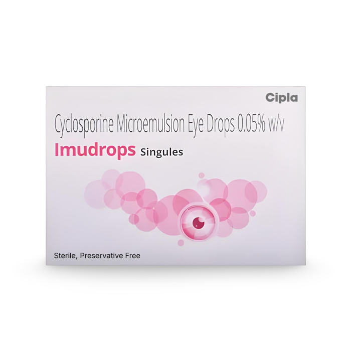 Imudrops Singules eye drops contain Closporin as their active ingredient. It works by reducing the production of the enzymes responsible for eye inflammation, boosting tear production, and reducing inflammation.