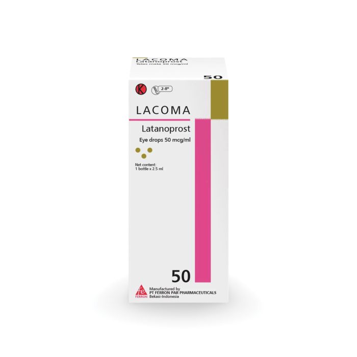 Lacoma Eye Drop is an effective medication for treating Ocular Hypertension or Glaucoma. It contains Latanoprost, a Prostaglandin analog, a drug class that treats Ocular Hypertension by lowering the liquid pressure within the eyes.