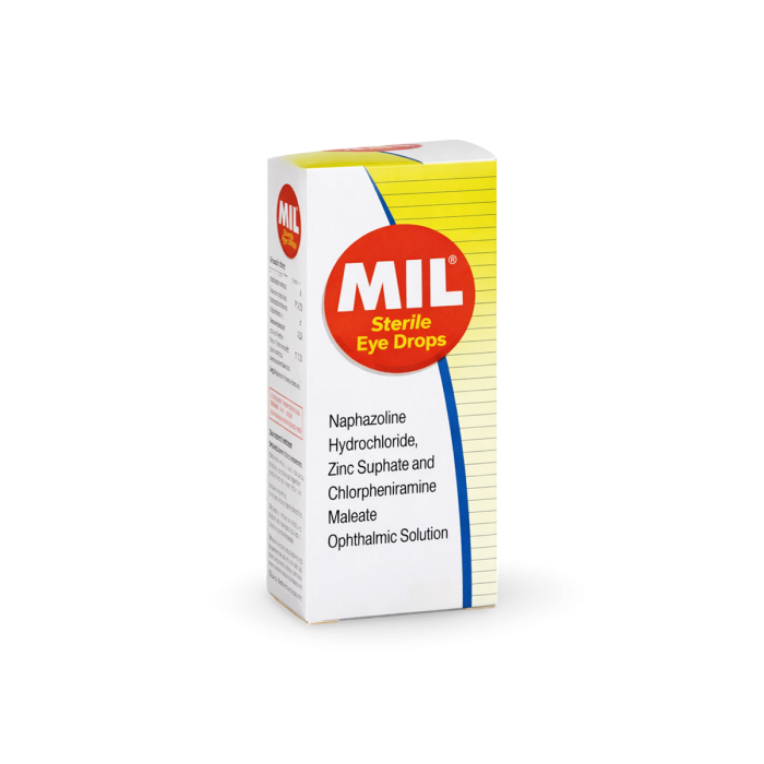 Mil 10 ml is an effective antihistamine decongestant eye drop that provides fast relief from eye irritation. It contains three active ingredients: Naphazoline Hydrochloride (0.056% w/v), Zinc Sulphate (0.12% w/v), and Chlorpheniramine Maleate (0.01% w/v).