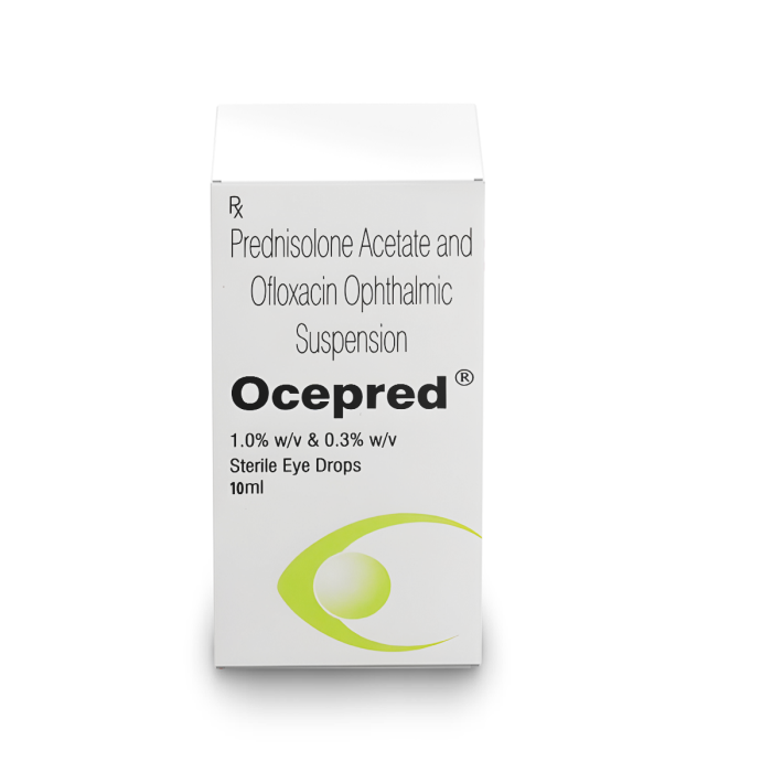Ocepred 10 ml is an eye drop formulated with two active ingredients: Ofloxacin, an antibiotic, and Prednisolone, a corticosteroid. This combination generally treats bacterial eye infections, including Conjunctivitis and Keratitis. Ofloxacin stops bacteria from multiplying and repairing themselves, thus successfully removing the infection. Prednisolone lowers inflammation and relieves symptoms, including redness, swelling, and pain in the affected eye.