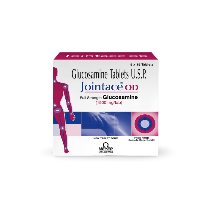 Jointace OD Tablet is a medication used to manage the symptoms of Osteoarthritis and support joint health. Its active salt is Glucosamine (1500 mg), which helps maintain healthy cartilage and improve joint movement. Glucosamine belongs to the amino sugar drug class and works as a chondroprotective agent that supports cartilage repair. Meyer Organics Pvt. Ltd. manufactures Jointace OD in accordance with GMP quality standards.
