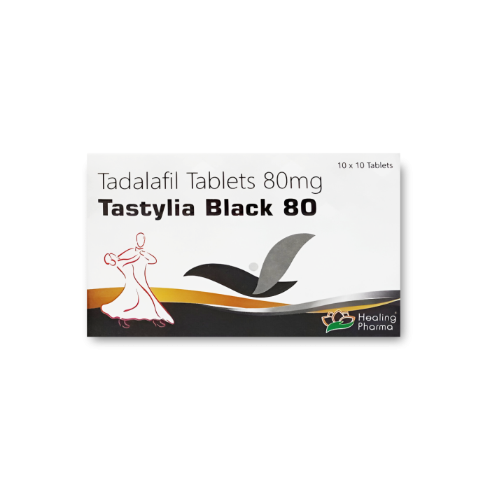 Tastylia Black 80 mg is a high-potency Erectile Dysfunction (ED) medicine designed for men who require stronger support for achieving and maintaining erections. It is manufactured by Healing Pharma India Pvt. Ltd., a GMP-certified pharmaceutical company known for its global quality standards and safe formulations.