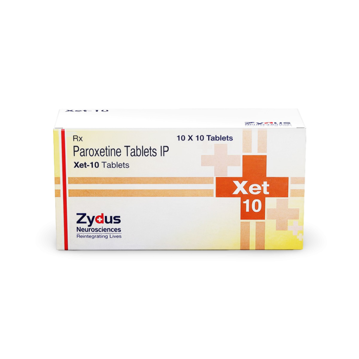 Xet 10 is a prescription antidepressant used for treating Major Depressive Disorder (MDD) and anxiety disorders. Its active ingredient, 10 mg of Paroxetine, is an FDA-approved Selective Serotonin Reuptake Inhibitor (SSRI) that enhances serotonin levels in the brain, helping to improve mood, reduce Anxiety, and promote emotional stability.