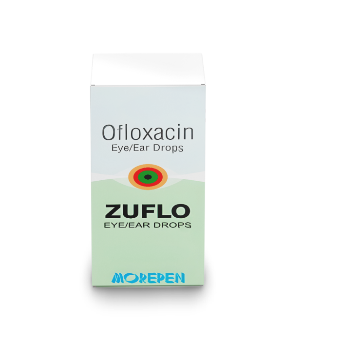 Zuflo Eye Drop is an ophthalmic solution that treats bacterial eye infections, including pink eye, redness, itching, and swelling. Its active ingredient is Ofloxacin, a quinolone antibiotic that inhibits bacterial growth, effectively fighting the infection. Morepen Laboratories Ltd manufactures Zuflo Eye Drop.